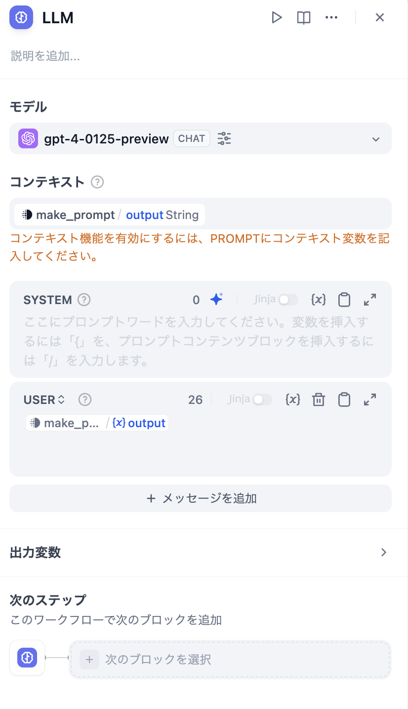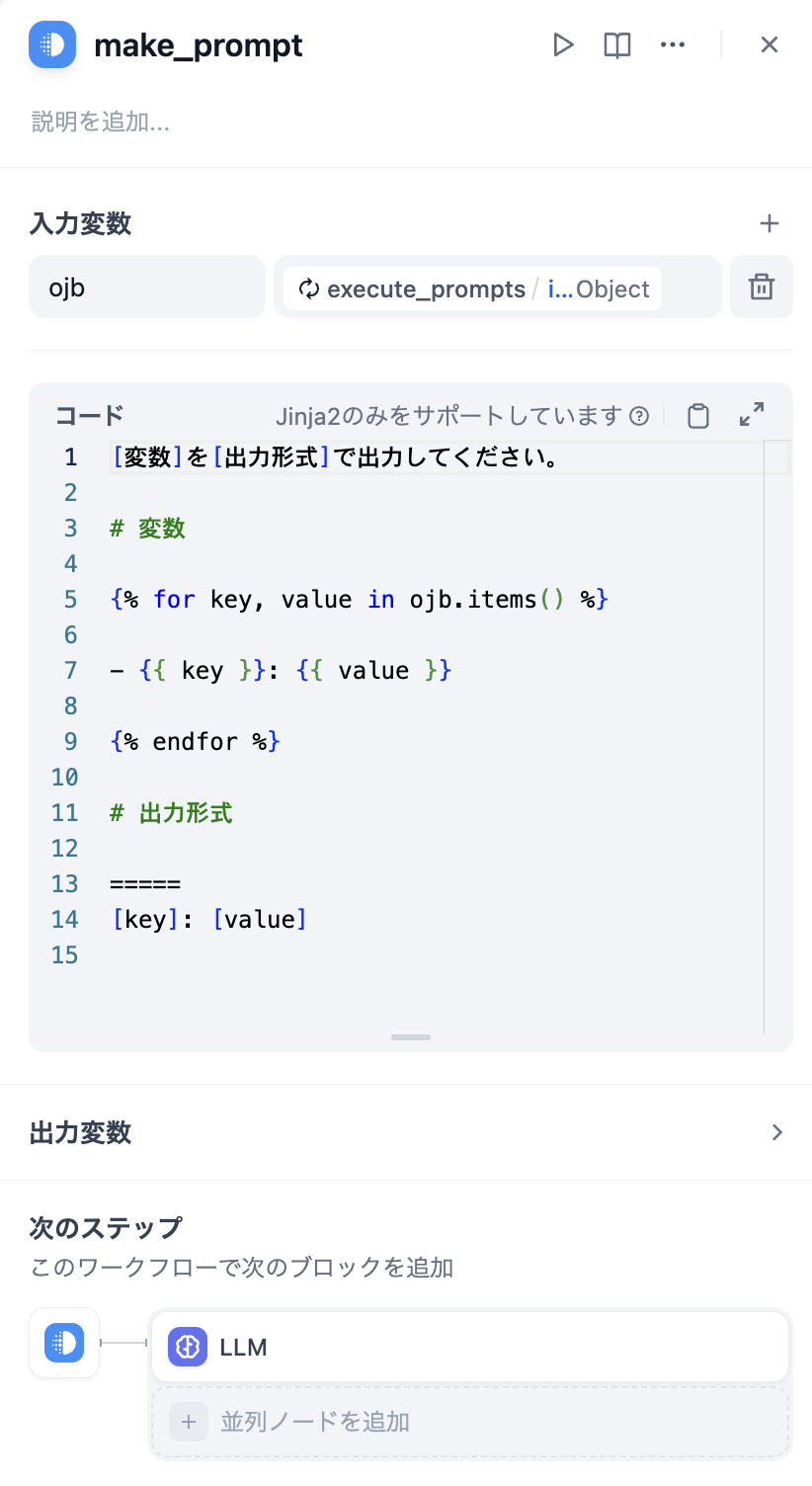プロンプトのテンプレートを作ってある。 辞書型が与えられるので Jinja テンプレートで埋め込んでいく。 テンプレートは以下の通り。