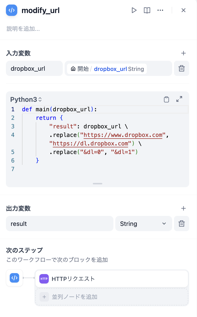 Dropbox 上でファイルの URL をコピーすると ”https://www.dropbox.com/” のように、ドメインの前に “www” がついているが、 これだと HTML を取得してしまう。 生の CSV を取得するためには ”https://dl.dropbox.com” のように “www” の部分を “dl” に変える必要がある。 ここでは、その変更処理を Python で行っている。 コードは以下のとおり。
