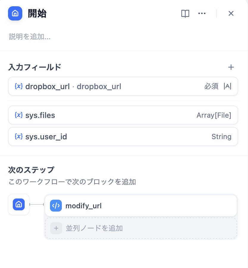 Dify のワークフローでファイル添付できない問題の解決策を考えた。 ただし、適用できるのは以下のケースで、非常に限定的である。